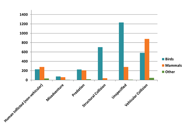 In preparation for this year’s State of Wildlife Health Report we conducted a database search of trauma incidents over the five-year period from 2013 through 2017. The results of this search produced 4892 incidents involving 3043 (62.2%) birds, 1743 (35.6%) mammals, and 106 (2.2%) other species (Fig.2). Collisions with vehicles represent the majority of trauma incidents with a total of 1507 (30.8%), while collisions with structures comprised an additional 742 (15.2%) incidents; combined these two forms of collision were responsible for 2249 (36%) trauma incidents. Human inflicted trauma (excluding vehicular collisions) were found to be responsible for approximately 540 (11%) incidents; misadventure was responsible for approximately 139 (2.8%) incidents; predation was the cause of approximately 447 (9.1%) incidents; and 1517 (31%) incidents resulted from some trauma that could not be specified.