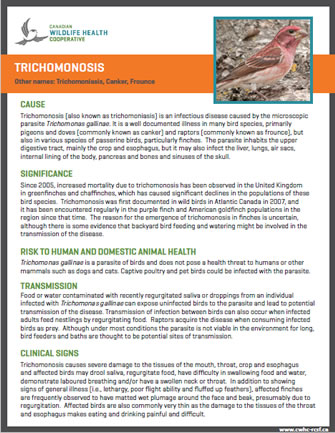 Trichomonosis (also known as trichomoniasis, canker, or frounce) is an infectious disease among many species of birds caused by the microscopic parasite Trichomonas gallinae. Since 2005, increased numbers of finches in the United Kingdom were found dead due to this disease. Trichomonosis was first documented in wild birds in Atlantic Canada in 2007. The reason for the emergence of this disease in finches is uncertain, although there is growing evidence that backyard bird feeding and watering might be involved.