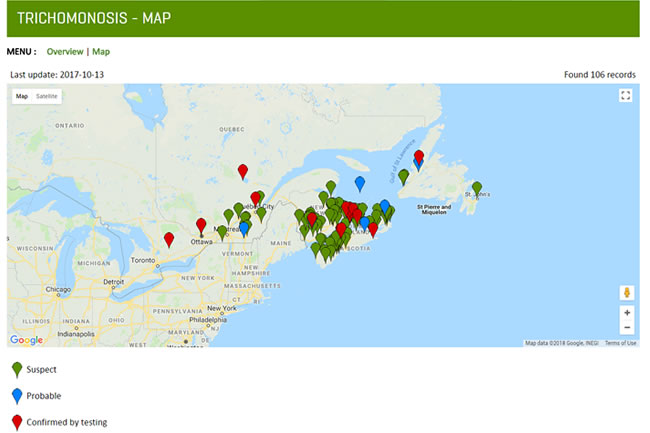 In early July, CWHC-Atlantic began to accumulate reports from the public of sick and dead finches showing signs of trichomonosis. CWHC confirmation of this disease and documentation of its spread gained extraordinary interest from the public and the media. Subsequently, more reports of potential incidents reported by the public from across Atlantic Canada and into Quebec and Ontario rapidly accumulated and were tracked by the CWHC.